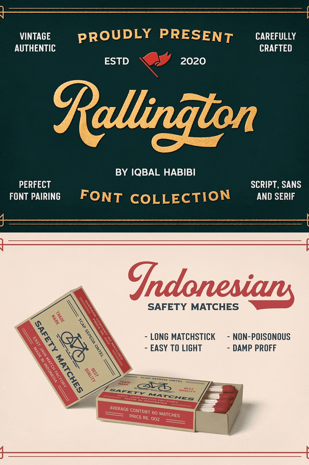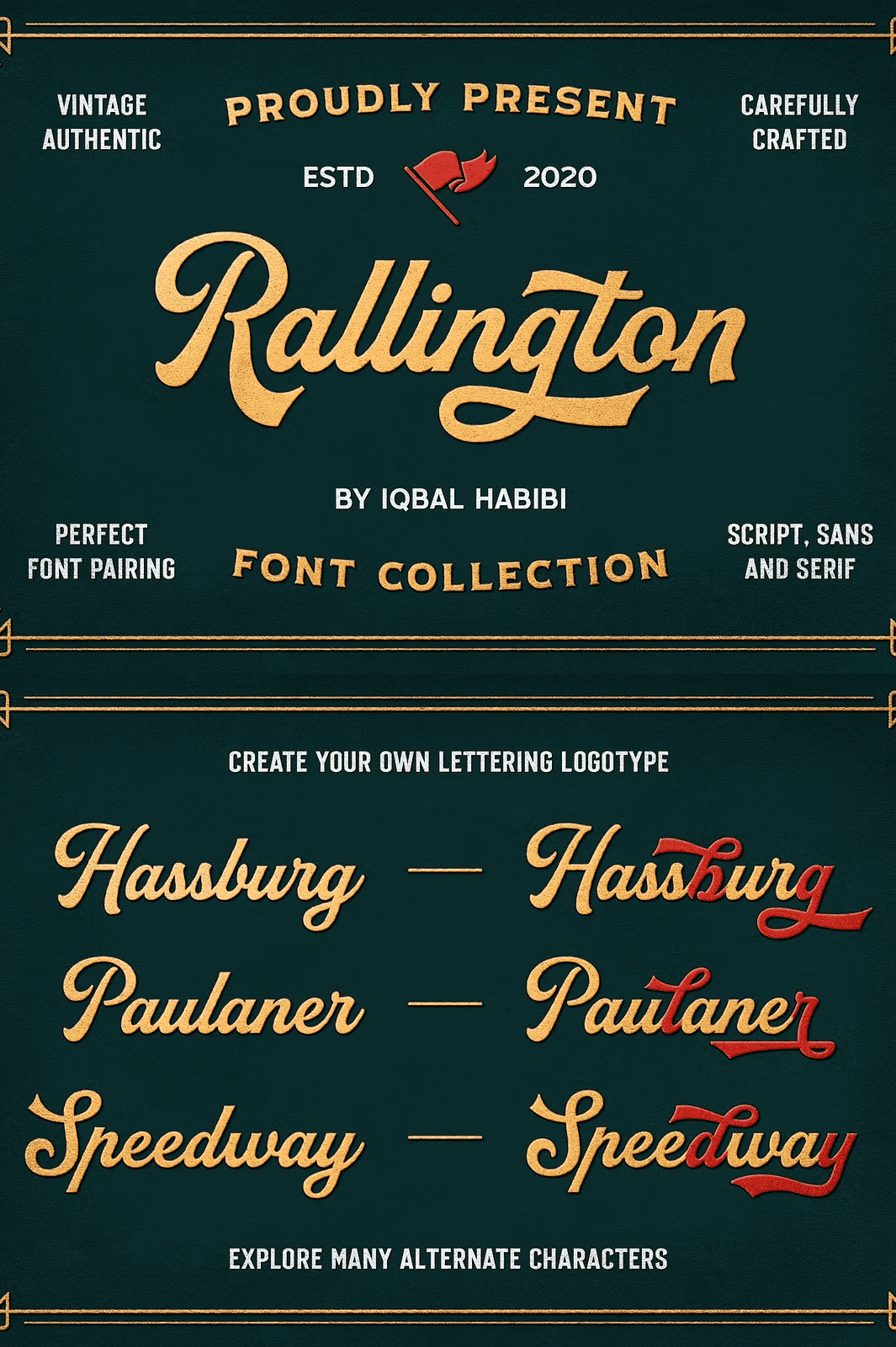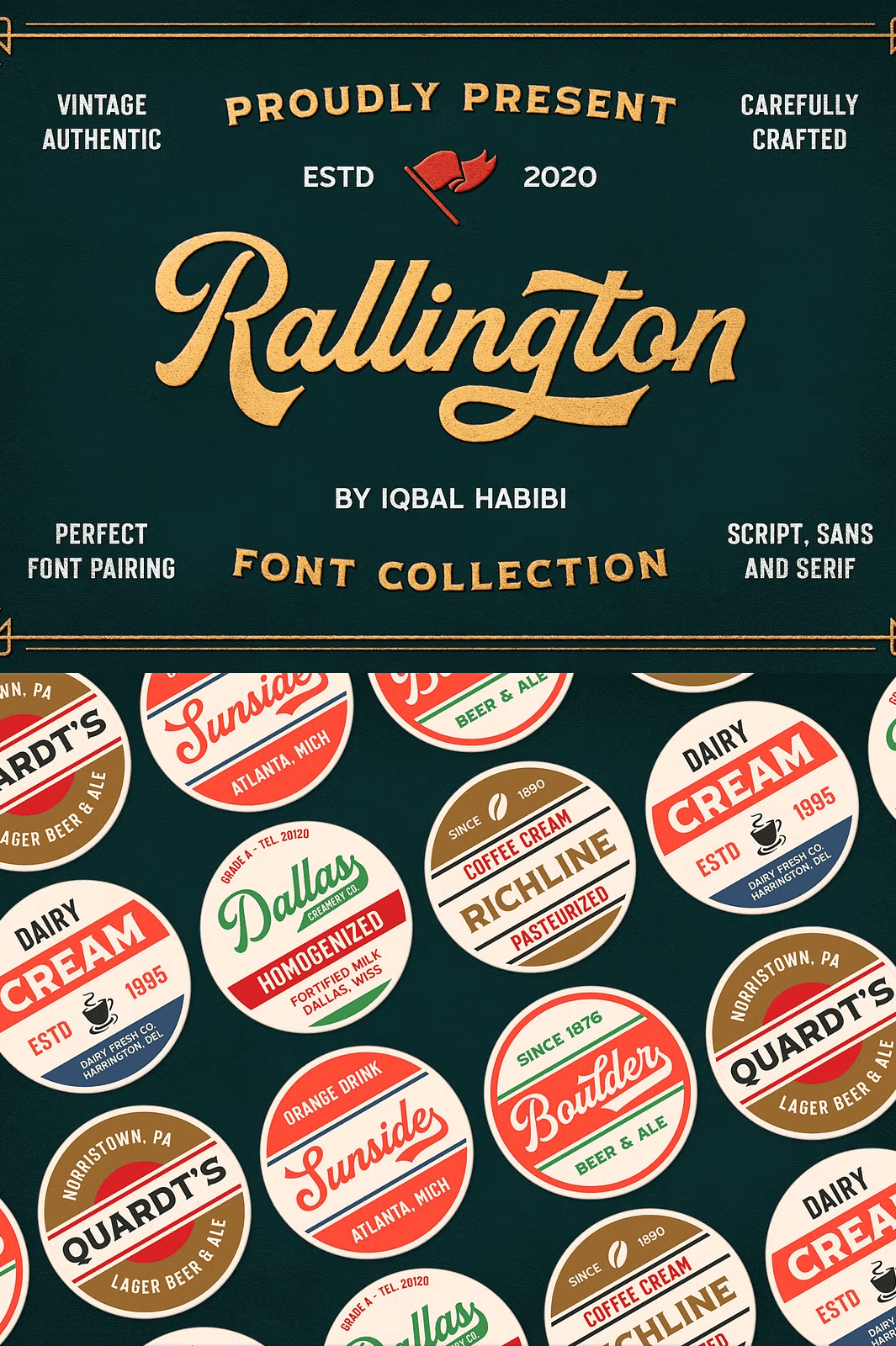 Rallington Font Collection captures the spirit of classic vintage lettering inspired by timeless beer labels, retro print advertisements, matchbox designs, and old-world signage. This versatile font set delivers authentic historical aesthetics with modern precision, giving your projects an instant sense of nostalgia, character, and visual impact. With **four unique fonts**, each crafted with distinct personality and rhythm, you gain limitless options for layering, pairing, and composing visually striking designs.