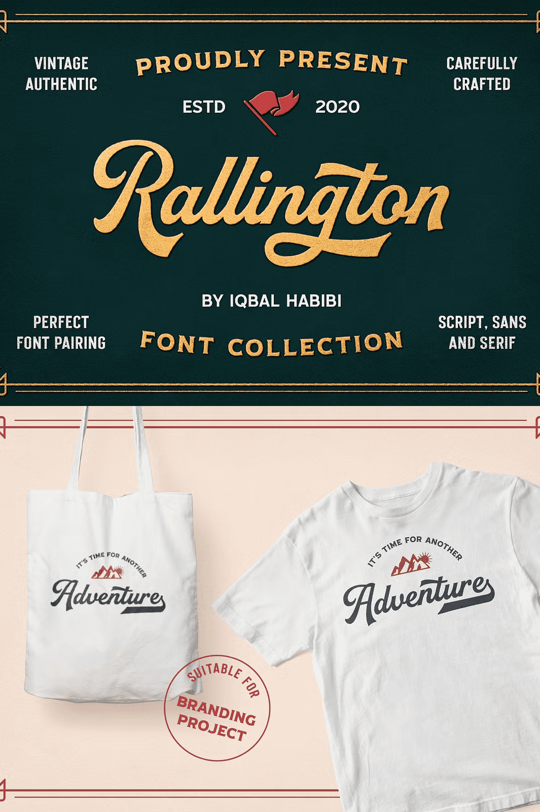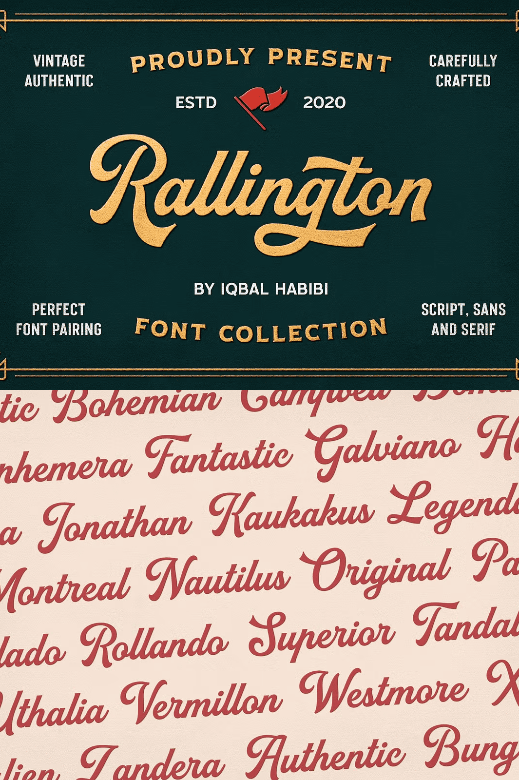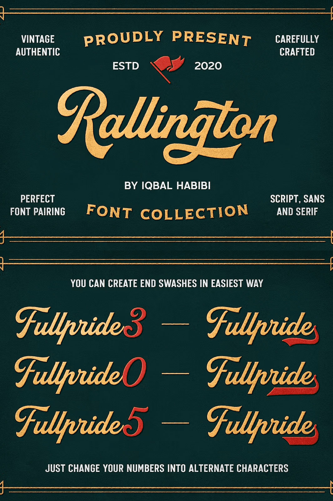 Rallington Font Collection captures the spirit of classic vintage lettering inspired by timeless beer labels, retro print advertisements, matchbox designs, and old-world signage. This versatile font set delivers authentic historical aesthetics with modern precision, giving your projects an instant sense of nostalgia, character, and visual impact. With **four unique fonts**, each crafted with distinct personality and rhythm, you gain limitless options for layering, pairing, and composing visually striking designs.