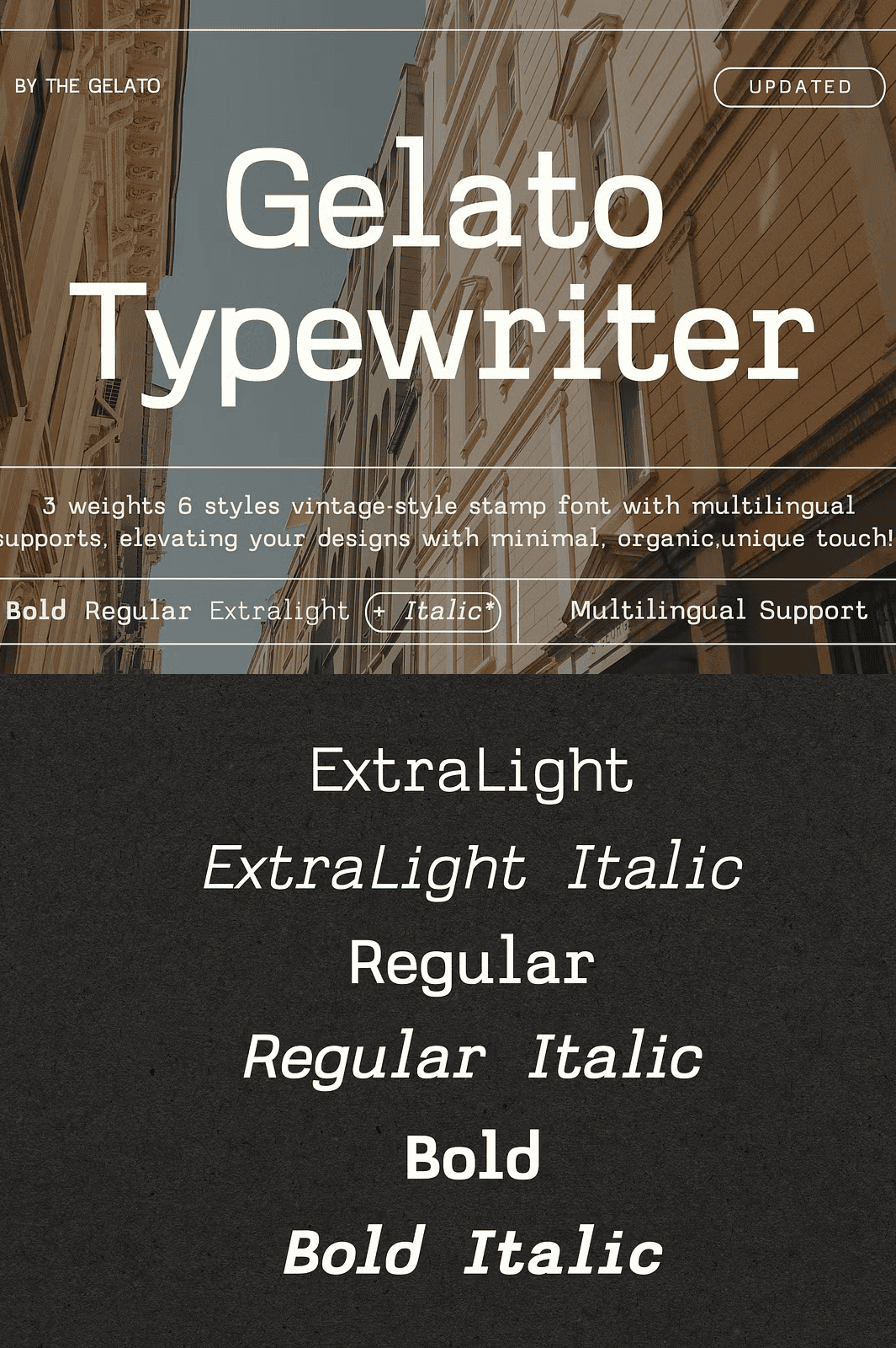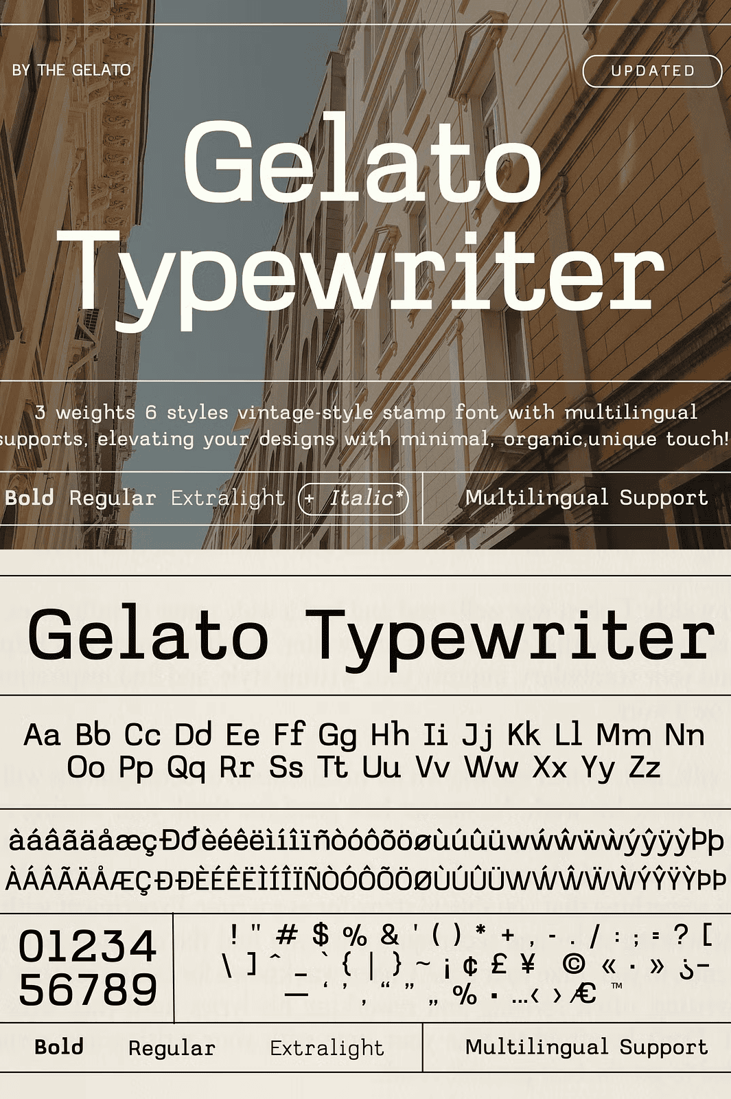Each character in Gelato Typewriter is thoughtfully designed to emulate the charm of real vintage typewriters and hand-stamped letters. With three distinct weights—Extra Light, Regular, and Bold—and six variations including italic styles, you have complete control over your design’s mood and emphasis. Use the Extra Light for subtle elegance, Regular for balanced readability, or Bold for impactful headlines. The italic styles add a touch of sophistication and dynamic flow, perfect for editorial features and quote displays.